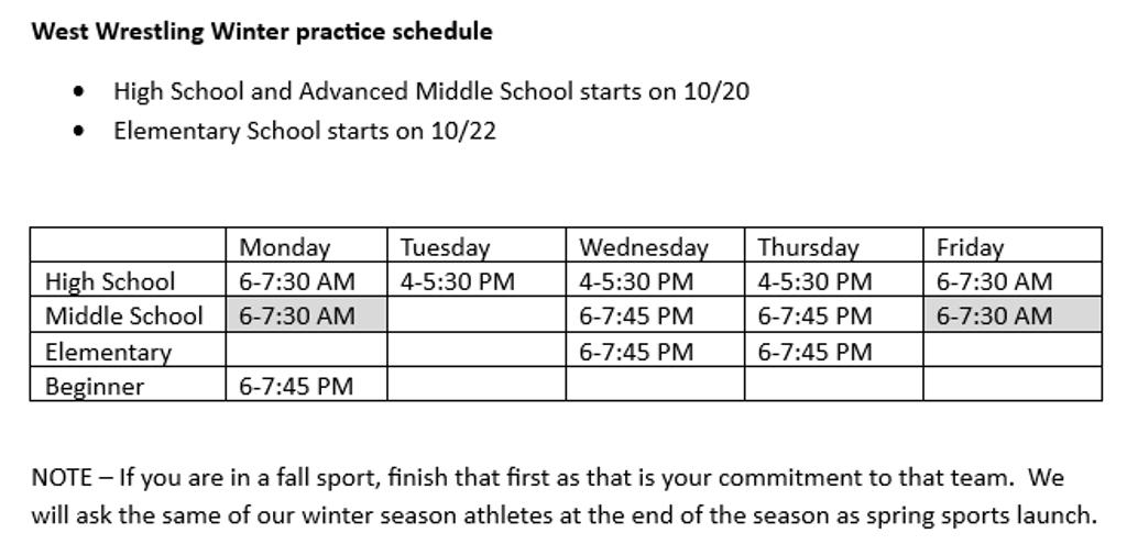 Morning Middle School practices are optional for more experienced Middle School wrestlers to join the High School team.